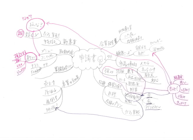ちなみに今回の写真は、あるパン屋さんがカフェ事業を新たに開発する際に使用した、補助金申請書の下書きマインドマップです。