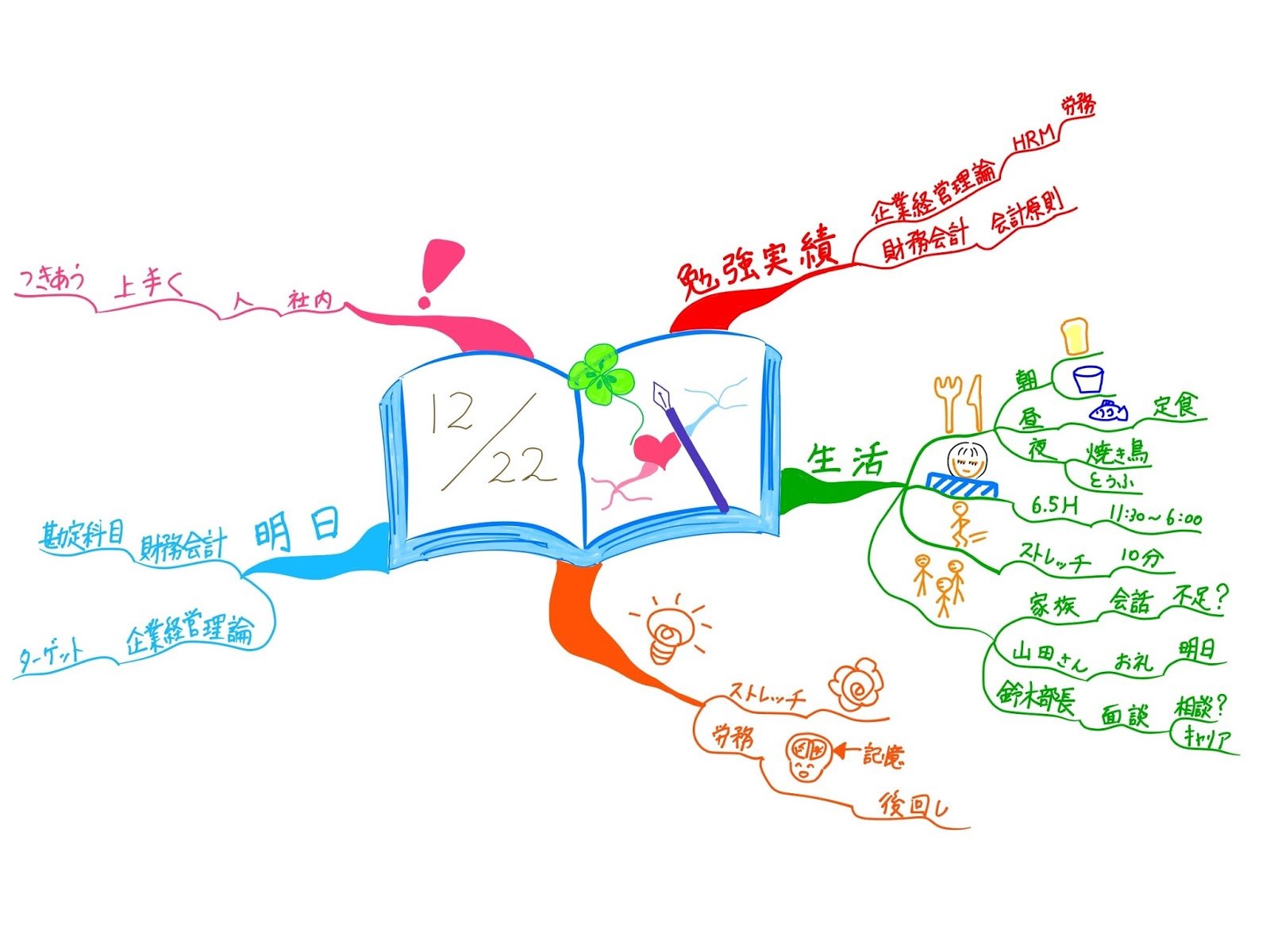 塚原美樹です。 マインドマップを試験勉強に活かすこのシリーズ、今回は、長期に渡る試験勉強期間中、自分自身のモチベーションを保つ方法について解説したいと思います。 いくつか方法があると思いますが、今日は、日々の振返りに使う日記のマインドマップをご紹介します。 マインドマップを90分で体験できる「マインドマップ オープン体験会」はこちら。...